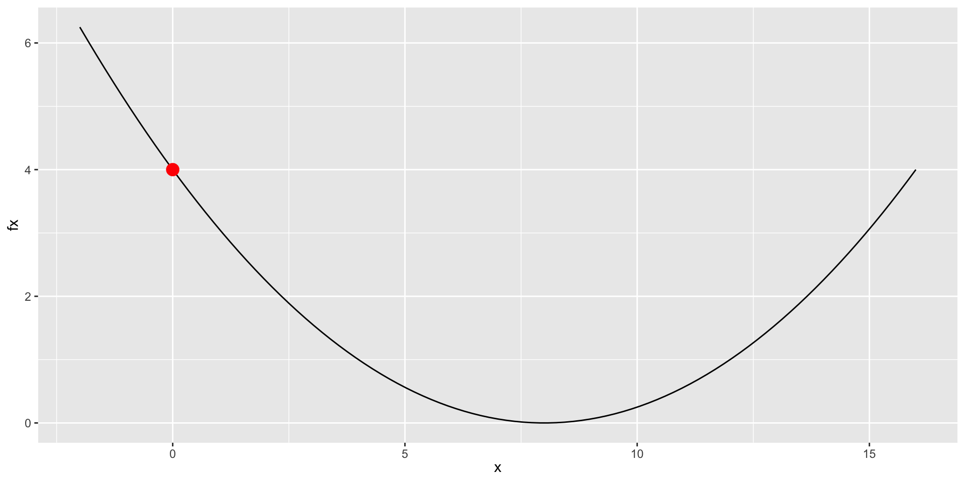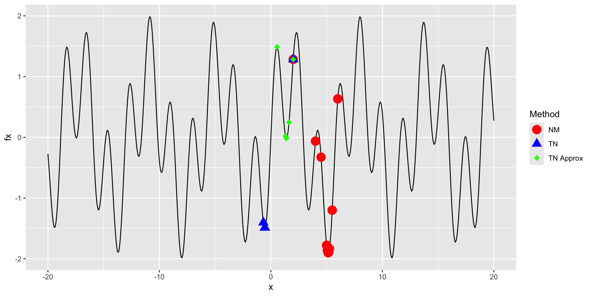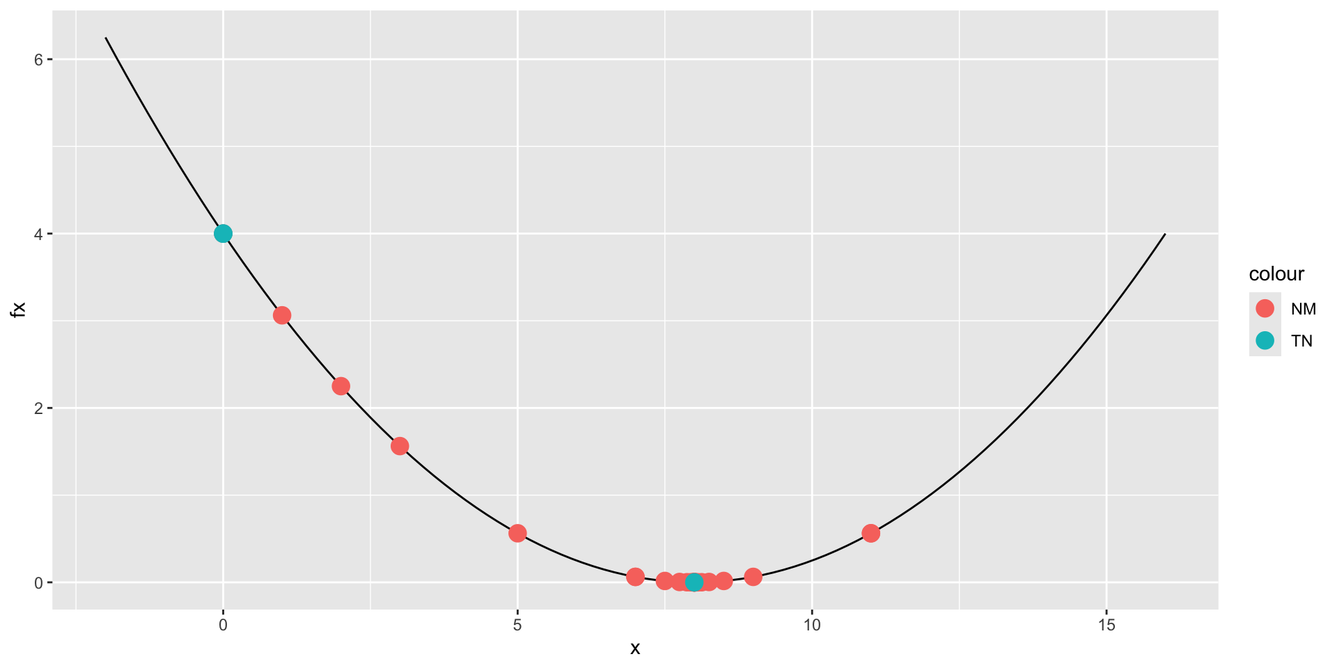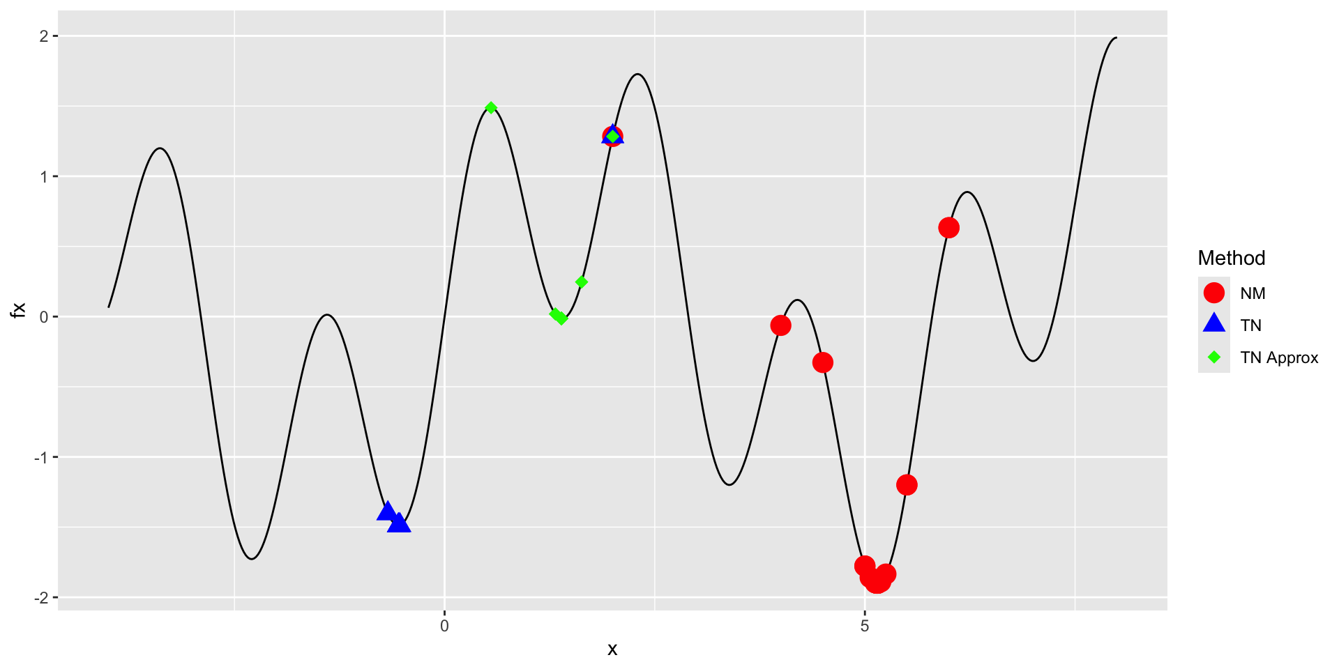 o_tn_approx <- my_nloptr(x0 = 2, eval_f = f, eval_grad_f = d_approx, opts = opts)Solutions: