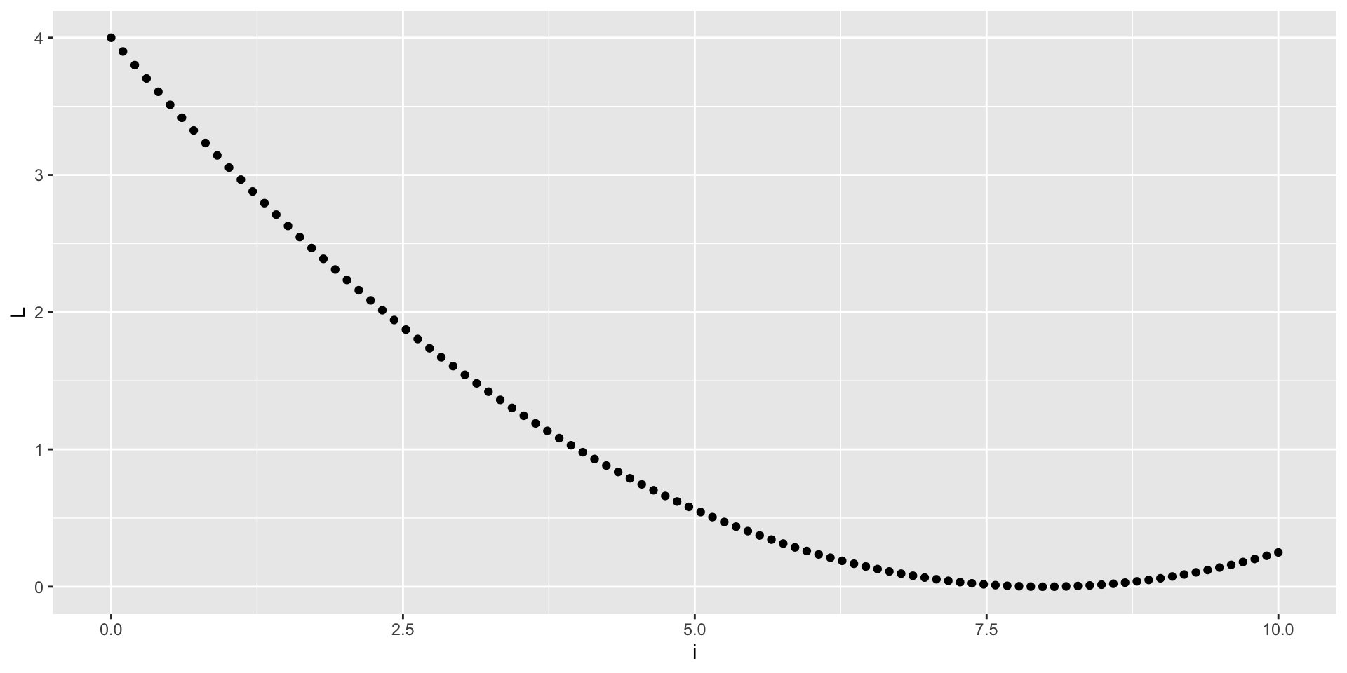 o <- my_nloptr(x0 = 0, eval_f = L, eval_grad_f = dL, opts = opts)