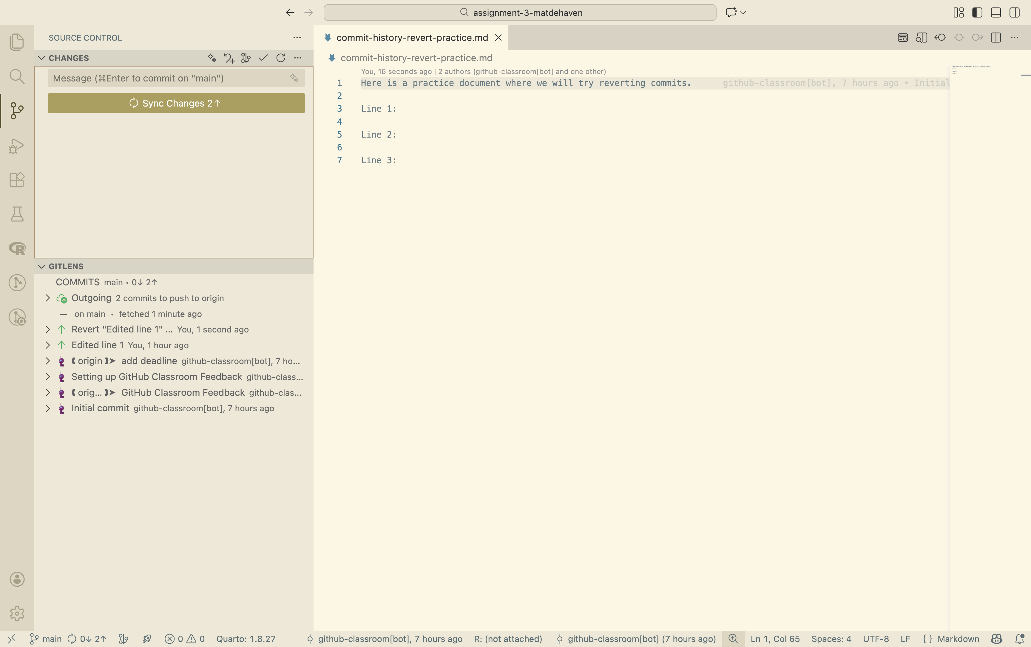 You should now see that your commit history no longer has the “Edited Line 3” commit. However, if you open up the “commit-history-revert-practice.md” file, you should see that all three lines are still there. The third line is now just a staged change that you can recommit if you want (or you could make additional edits).
