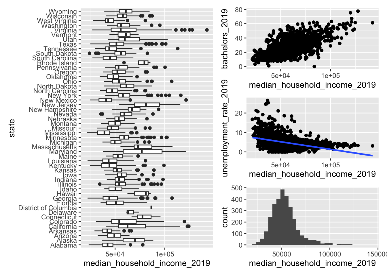 A scatter plot of “median_household_income_2019” and another of your 5 independent variables