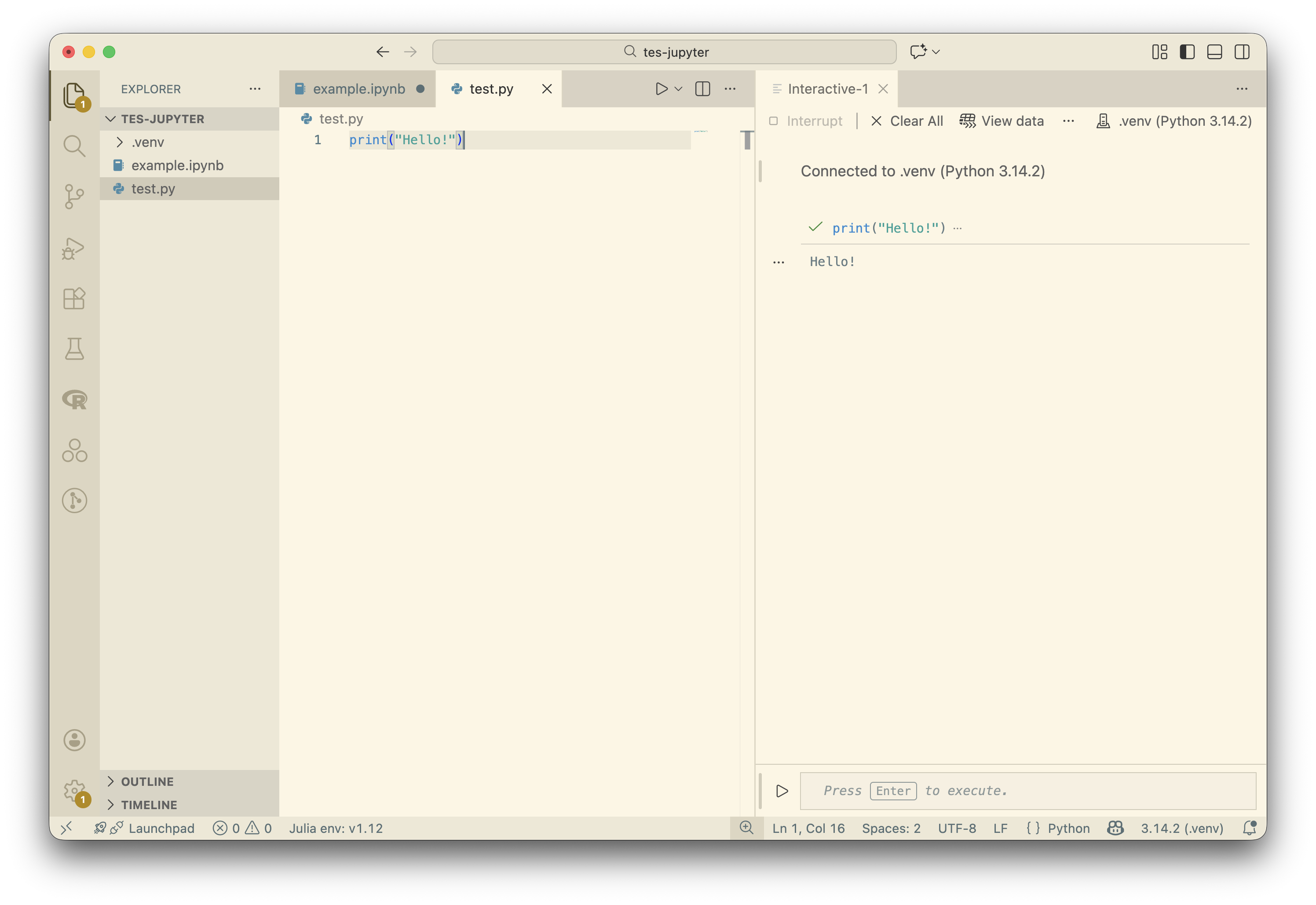- Create an empty file called “example.ipynb”, open it in VS Code