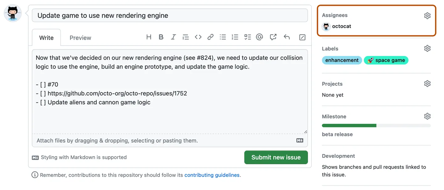Issues can be assigned to yourself or to other GitHub users working on the repository.