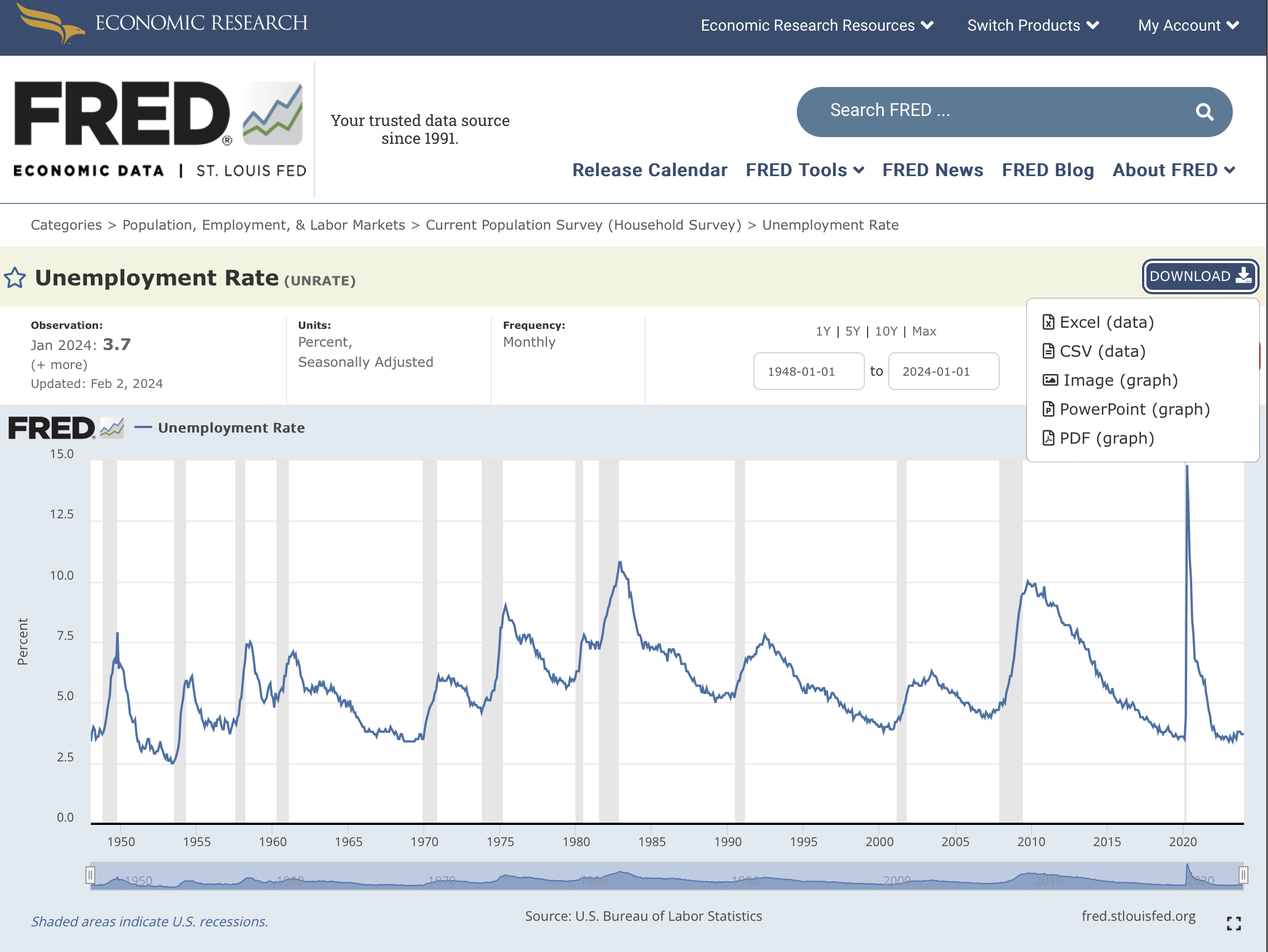 <series id="UNRATE" realtime_start="2024-02-19" realtime_end="2024-02-19" title="Unemployment Rate" observation_start="1948-01-01" observation_end="2024-01-01" frequency="Monthly" frequency_short="M" units="Percent" units_short="%" seasonal_adjustment="Seasonally Adjusted" seasonal_adjustment_short="SA" last_updated="2024-02-02 07:49:02-06" popularity="94" notes="The unemployment rate represents the number of unemployed as a percentage of the labor force. Labor force data are restricted to people 16 years of age and older, who currently reside in 1 of the 50 states or the District of Columbia, who do not reside in institutions (e.g., penal and mental facilities, homes for the aged), and who are not on active duty in the Armed Forces.