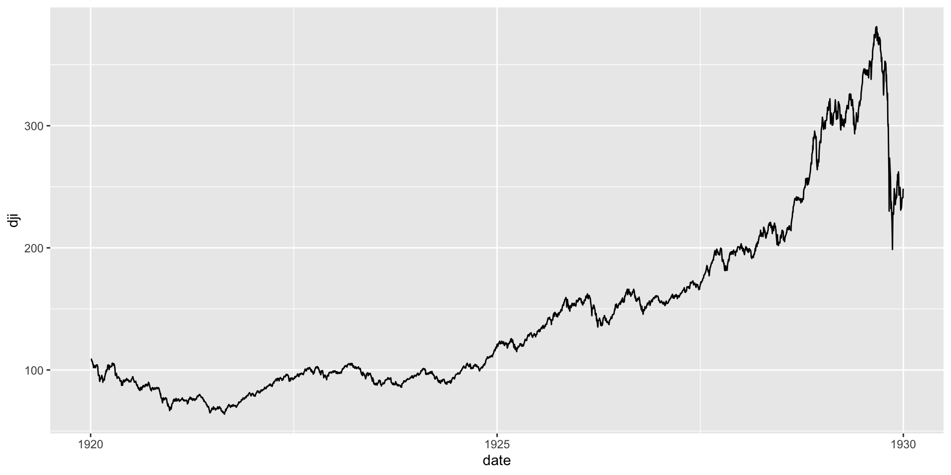data |> ggplot(aes(x = date, y = dji)) + geom_line()