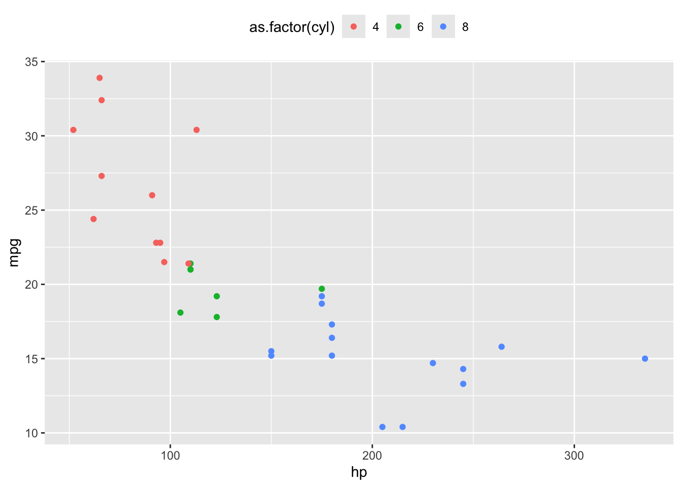 mapping = aes(x = hp, y = mpg, color = cyl)