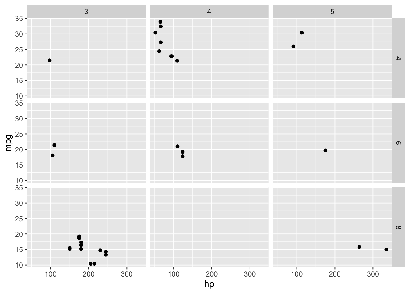 facet_grid(rows = vars(cyl), cols = vars(gear))