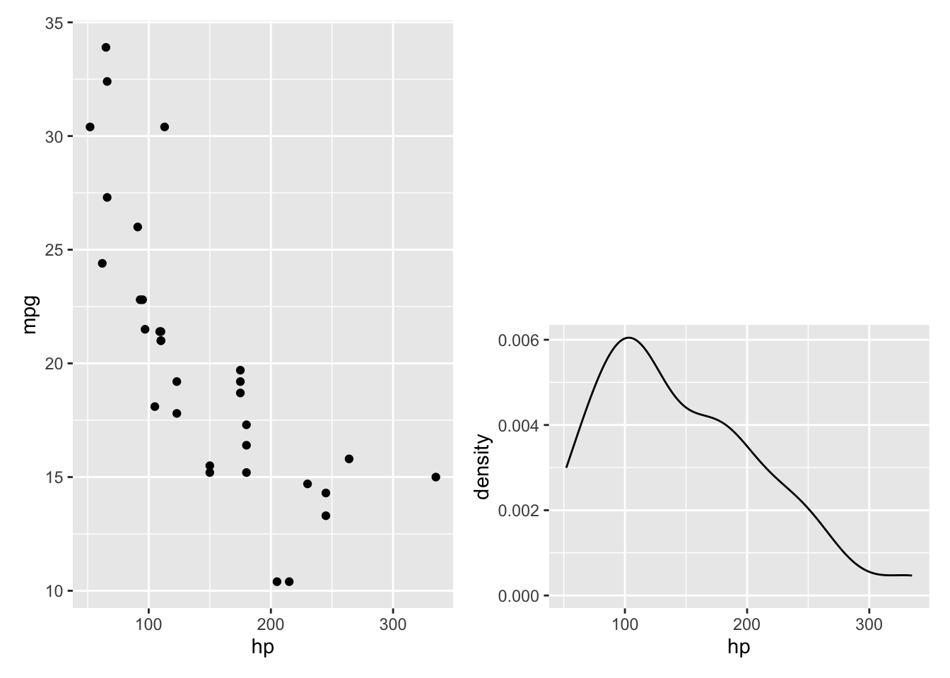 ggplot(aes(x = gear, y = hp, group = gear )) + geom_boxplot()Combining plots